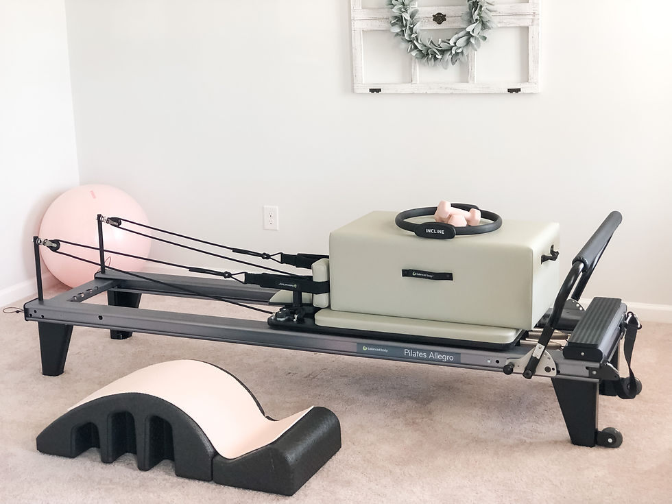 Located in my home in Cane Bay (Summerville, SC), the studio is equipped with a Reformer, a Stall Bars/Springboard tower, multiple Pilates props for matwork, and an aerial hammock for Aerial & Restorative Pilates.